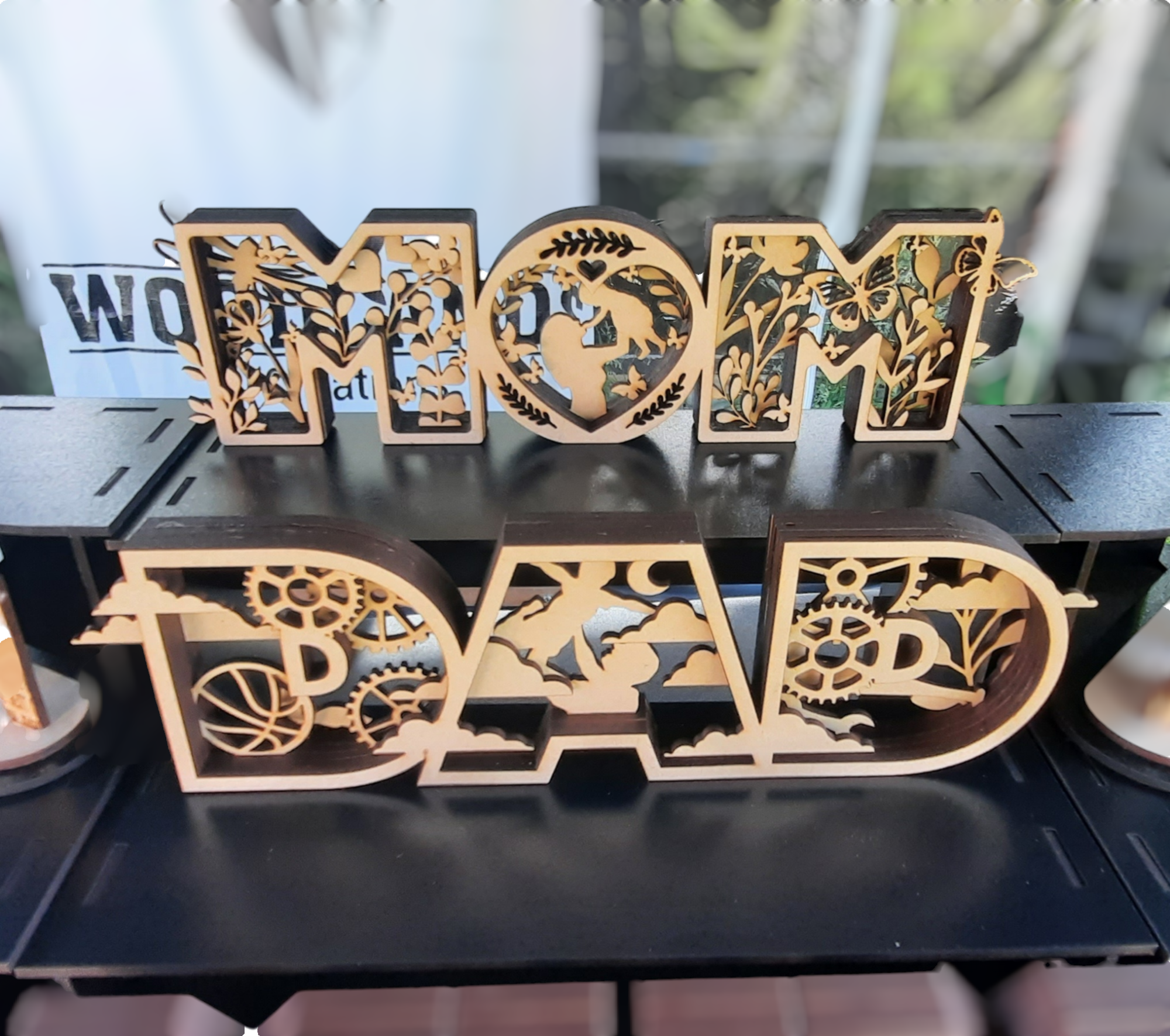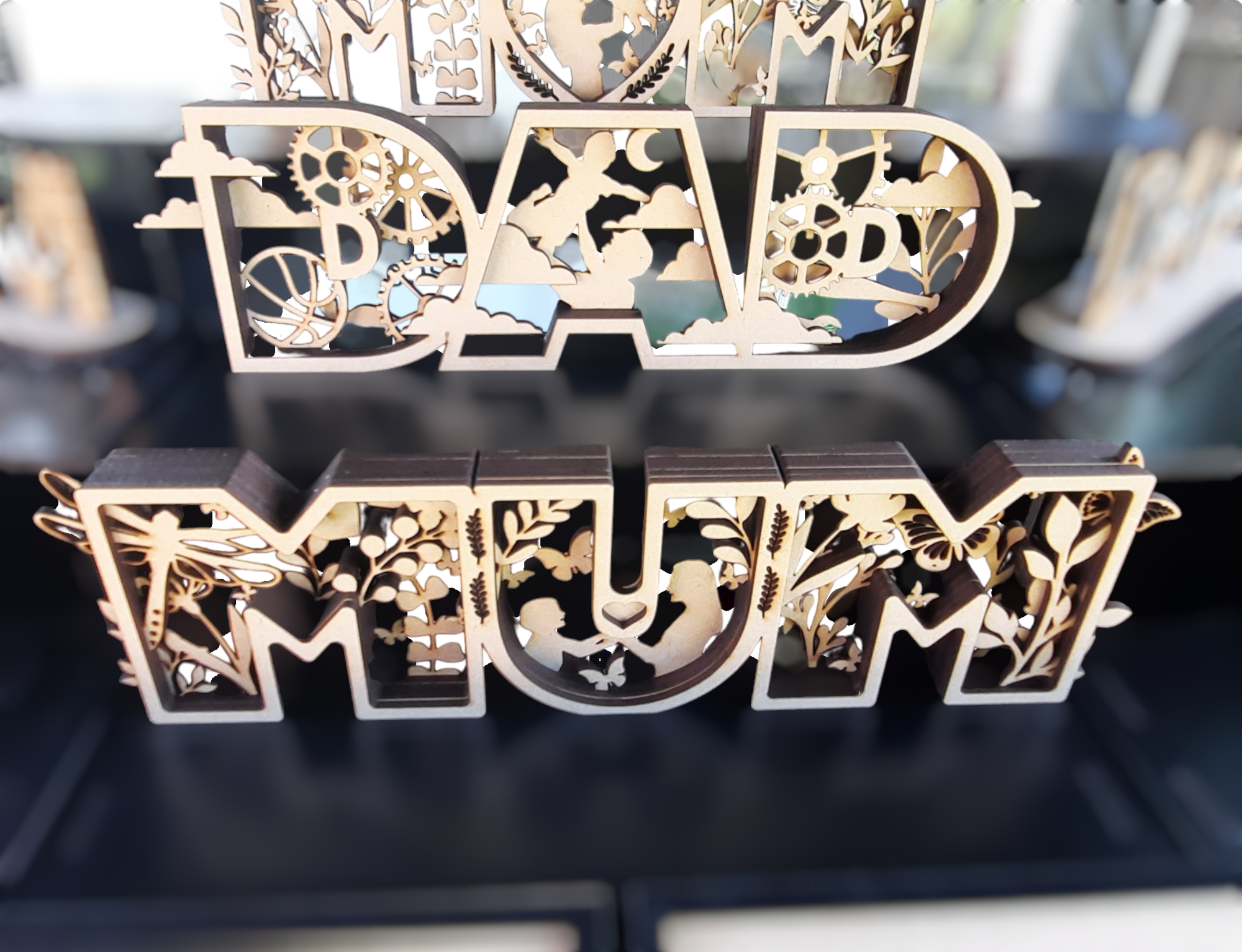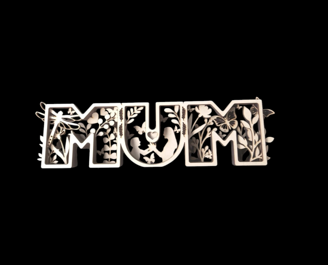 Looking for the perfect personalised gift for Mum, Dad, or that special parent figure? These handcrafted wooden cutouts are a heartfelt way to say I love you. Each letter is intricately laser-cut with symbolic designs—floral patterns, butterflies, gears, moons, and silhouettes that celebrate love, care, and family bonds.